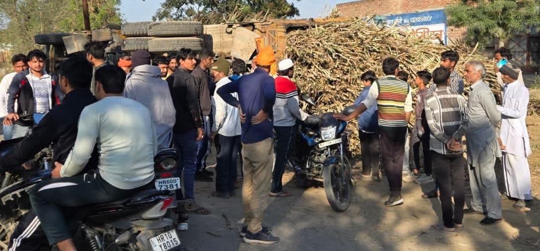 झाड़खेड़ी में सड़क पर पलटा गन्ने से भरा ओवरलोड ट्रक