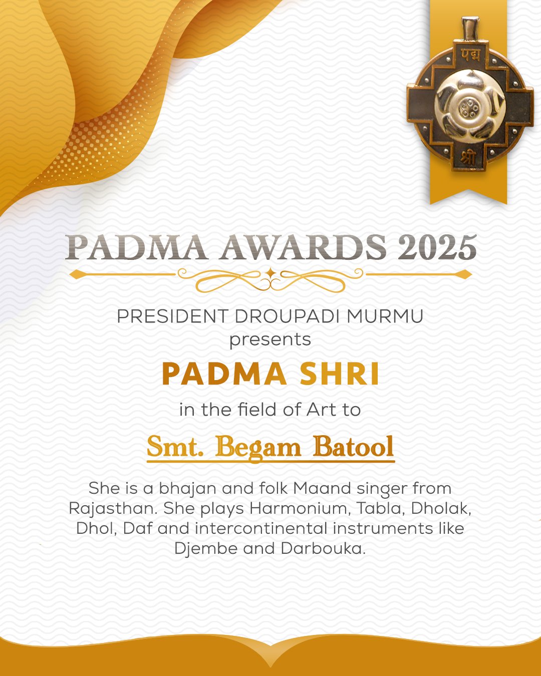 बेगम बतूल का यह सफर न सिर्फ संगीत की दुनिया में उनके योगदान को दर्शाता है, बल्कि समाज में सांस्कृतिक विरासत और लैंगिक समानता के प्रति जागरूकता का भी प्रतीक है। पद्म श्री से सम्मानित होना उनकी लगन और समर्पण को एक नया आयाम देगा, ऐसी उम्मीद संगीत प्रेमियों ने जताई है।