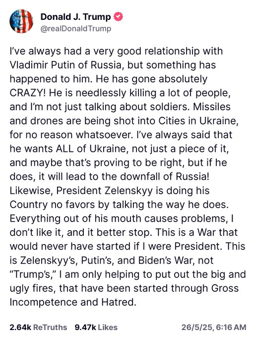 ट्रंप ने लिखा, “मेरे और पुतिन के बीच हमेशा अच्छे संबंध रहे, लेकिन अब वह बिल्कुल पागल हो गए हैं। वह बेवजह लोगों को मार रहे हैं—और मैं सिर्फ़ सैनिकों की नहीं, बल्कि आम लोगों की बात कर रहा हूँ।” उन्होंने आगे कहा कि पुतिन यूक्रेन का सिर्फ़ एक हिस्सा नहीं, बल्कि पूरा देश हड़पना चाहते हैं, और अगर वह ऐसा करते हैं, तो “रूस का पतन हो जाएगा।”