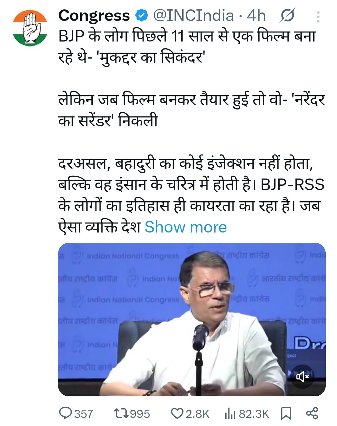कांग्रेस के प्रवक्ता और AICC मीडिया एवं पब्लिसिटी विभाग के चेयरमैन पवन खेड़ा ने भाजपा और प्रधानमंत्री नरेंद्र मोदी पर करारा प्रहार करते हुए कहा कि “BJP के लोग पिछले 11 साल से ‘मुकद्दर का सिकंदर’ फिल्म बना रहे थे, लेकिन जब फिल्म रिलीज हुई तो वह ‘नरेंदर का सरेंदर’ निकली।” उन्होंने आगे कहा कि “बहादुरी का कोई इंजेक्शन नहीं होता, यह इंसान के चरित्र में होती है, और BJP-RSS का इतिहास ही कायरता का रहा है।