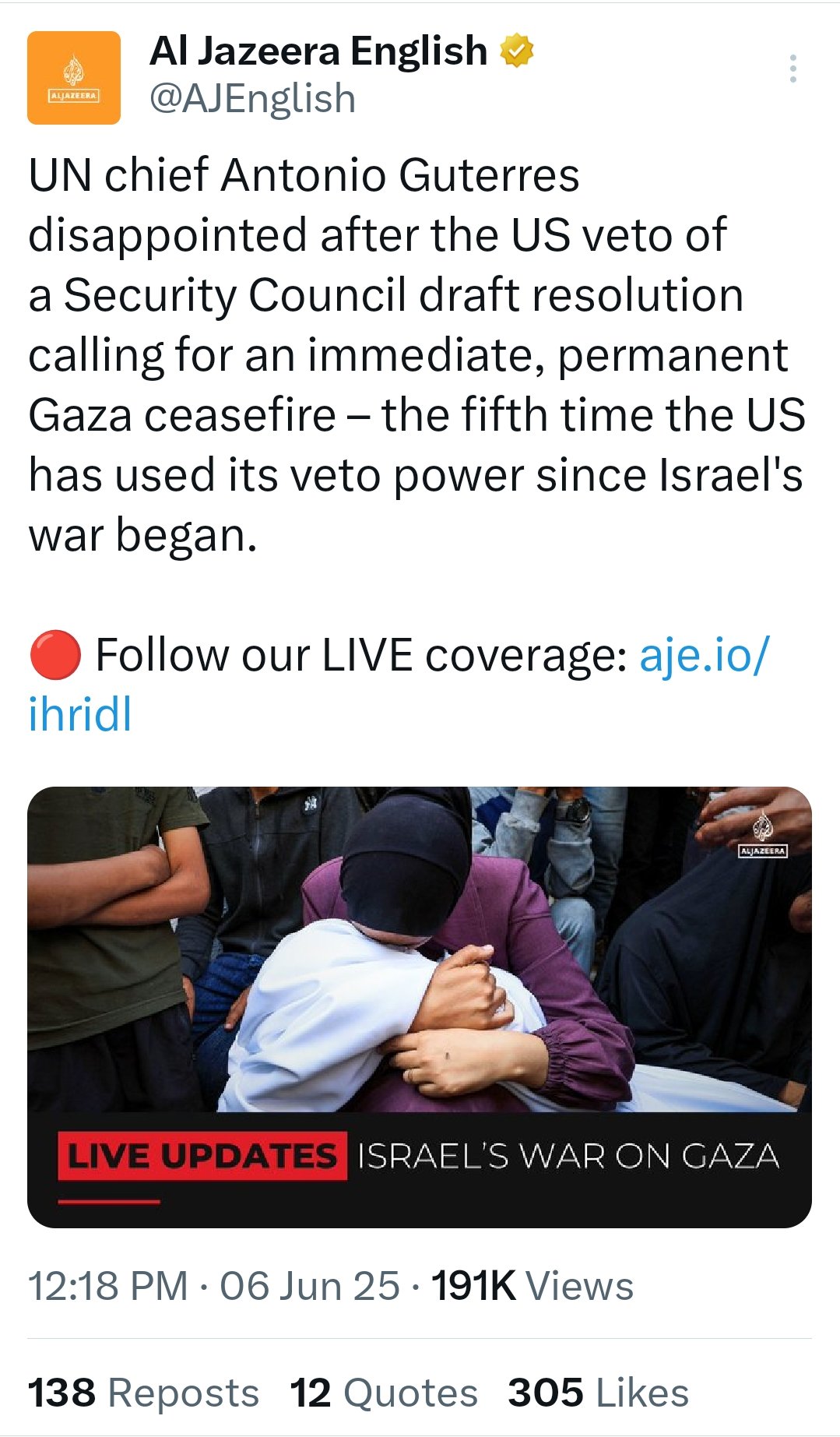 संयुक्त राष्ट्र महासचिव एंटोनियो गुटेरेस ने गुरुवार को अमेरिका द्वारा संयुक्त राष्ट्र सुरक्षा परिषद (UNSC) के एक प्रस्ताव पर वीटो का इस्तेमाल करने पर गहरी निराशा जाहिर की। यह प्रस्ताव गाजा पट्टी में “तत्काल, बिना शर्त और स्थायी युद्धविराम” की मांग करता था और मानवीय सहायता पर प्रतिबंध हटाने का आह्वान करता था। यह इस्राइल के साथ युद्ध शुरू होने के बाद से अमेरिका का पांचवां वीटो है।