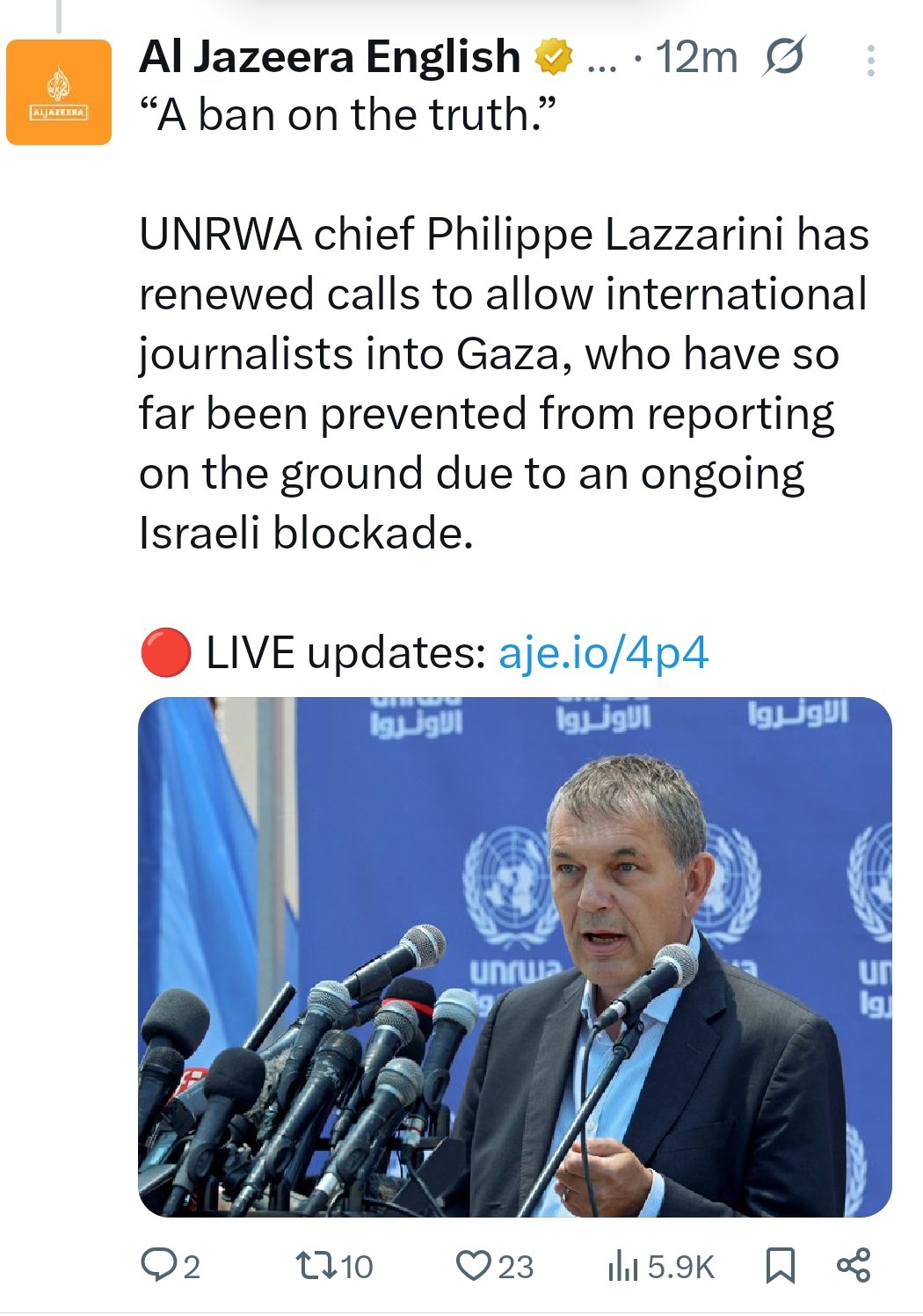 फिलिस्तीन के गाजा पट्टी में इजरायली सेना द्वारा लगाए गए नाकाबंदी के चलते अंतर्राष्ट्रीय पत्रकारों को रिपोर्टिंग की अनुमति नहीं दी जा रही है। UNRWA (संयुक्त राष्ट्र राहत और कार्य एजेंसी) के प्रमुख फिलिप लज़ारिनी ने इस स्थिति को “सत्य पर प्रतिबंध” बताते हुए तुरंत अंतर्राष्ट्रीय मीडिया को गाजा में प्रवेश की अनुमति देने की मांग की है।