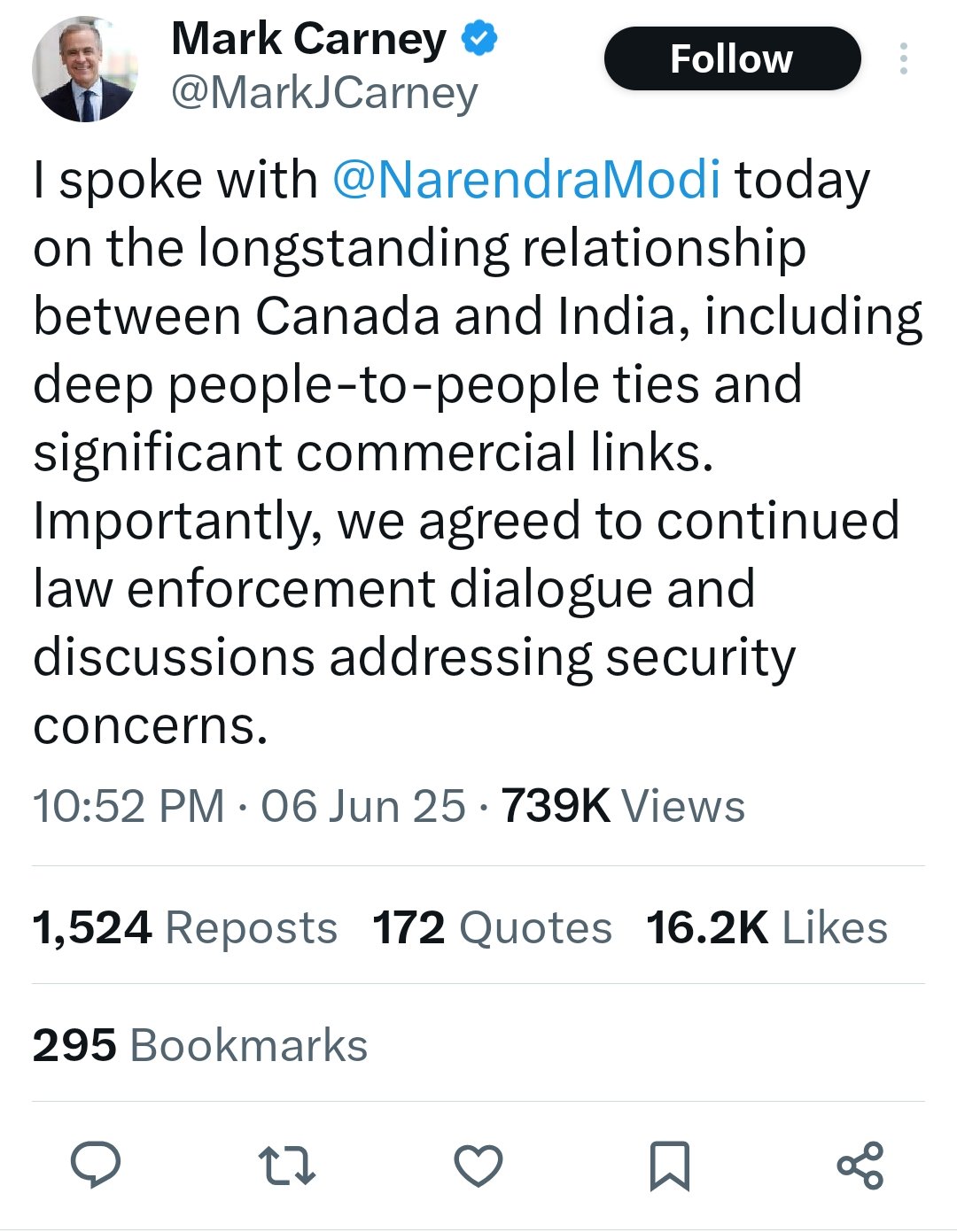 कनाडा और भारत के बीच सुरक्षा सहयोग पर आज चर्चा हुई, मोदी और कनाडाई नेता ने साझेदारी बढ़ाते हुए प्रवासी भारतीयों और व्यापारिक संबंधों पर बातचीत की, साथ ही कानून प्रवर्तन एजेंसियों का संवाद जारी रखने पर सहमति जताई और सुरक्षा चिंताओं को दूर करने पर ज़ोर दिया। यह सब जानकारी कनाडाई पीएम मार्क कार्नी ने ट्वीट करते हुए दी।