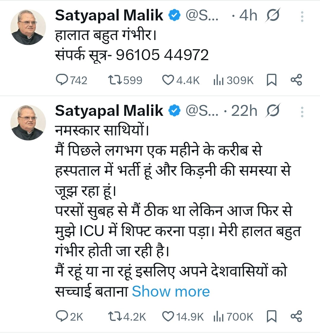 हालत बहुत गंभीर… मैं रहूं या न रहूं, देशवासियों को सच बताना चाहता हूं”: ICU से सत्यपाल मलिक का भावुक ट्वीट, रिश्वत से लेकर CBI चार्जशीट तक सब खोला!