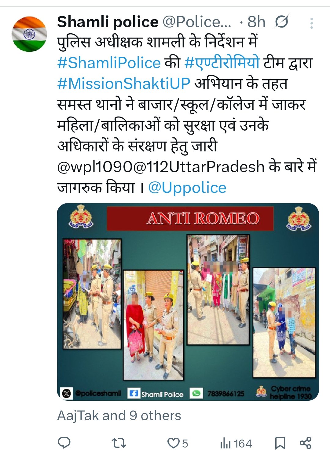 शामली, 08 जून 2025: पुलिस अधीक्षक शामली राम सेवक गौतम के निर्देशन में #ShamliPolice की #एंटीरोमियो_टीम ने #MissionShaktiUP अभियान के पाँचवें चरण के तहत जनपद के सभी थानों को महिला एवं बालिका सुरक्षा हेतु विशेष अभियान चलाने के आदेश दिए। इसके तहत टीमों ने बुधवार को बाजारों, स्कूलों, कॉलेजों एवं सार्वजनिक स्थानों पर जाकर महिलाओं को उनके अधिकारों, सुरक्षा योजनाओं और हेल्पलाइन नंबरों @wpl1090 (वूमन पावर लाइन) तथा @112UttarPradesh (पुलिस आपातकालीन सेवा) के बारे में विस्तृत जानकारी दी।