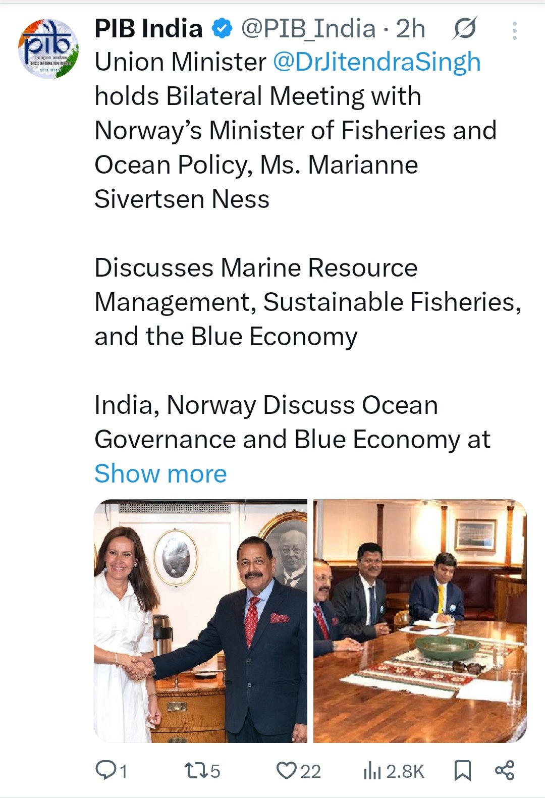 भारत और नॉर्वे ने समुद्री संसाधन प्रबंधन पर की मजबूत साझेदारी की चर्चा! ; जितेंद्र सिंह और नॉर्वे मंत्री ने UN महासागर सम्मेलन में बैठक आयोजित कर द्विपक्षीय वार्ता की, और समुद्री शासन और आर्थिक सहयोग को बढ़ावा देने व सतत मत्स्य पालन और ब्लू इकॉनमी पर गहन चर्चा की!