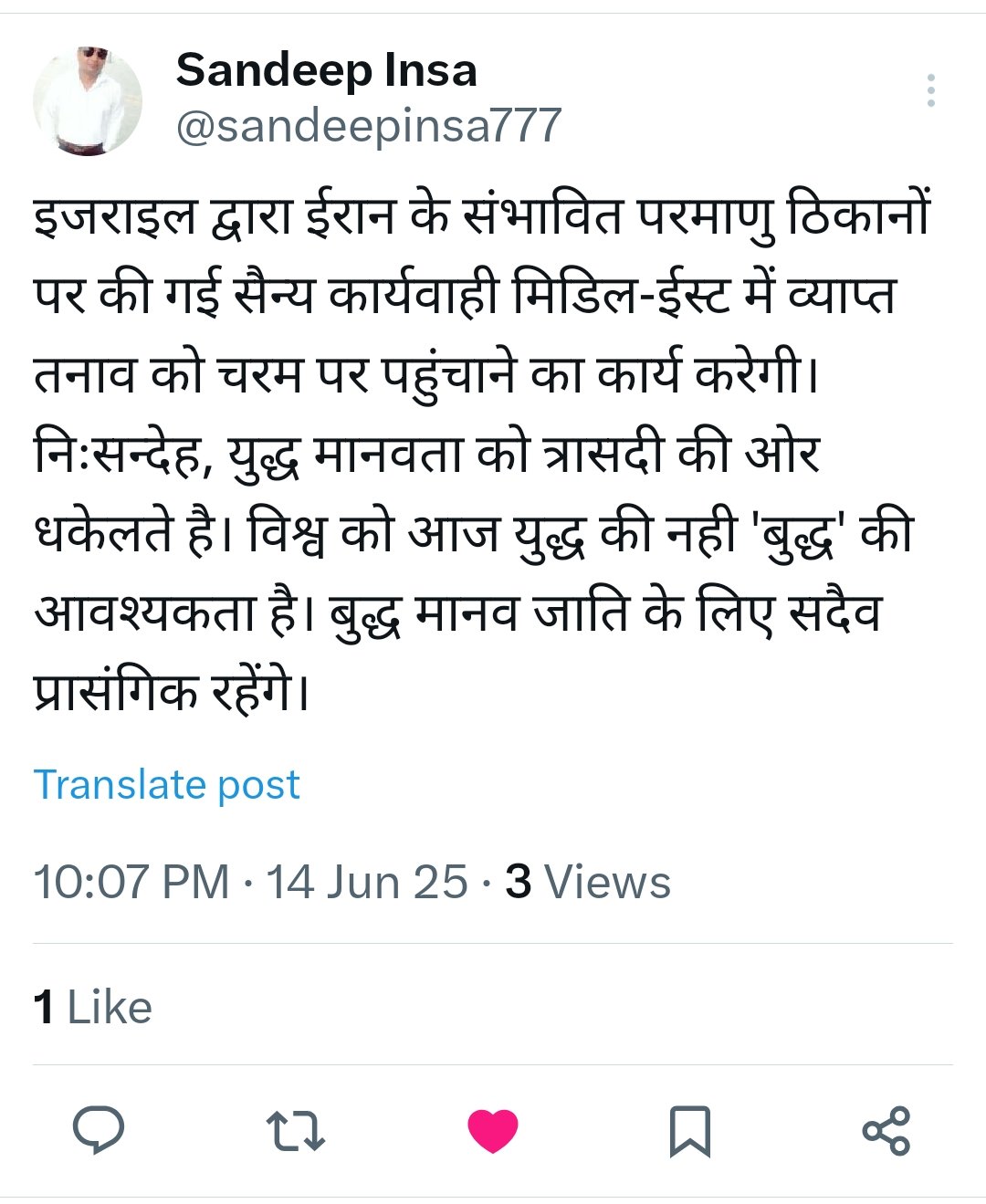 श्री संदीप इन्सां का यह पोस्ट सोशल मीडिया पर तेज़ी से वायरल हो रहा है और जनमत में “शांति बनाम युद्ध” की बहस को नई दिशा दे रहा है।
